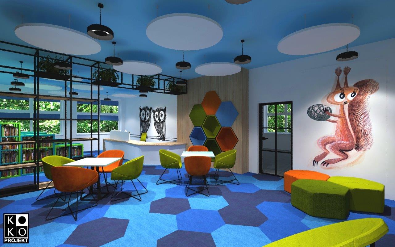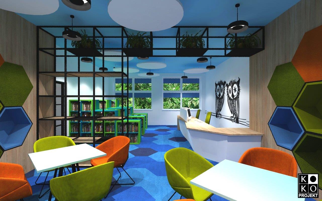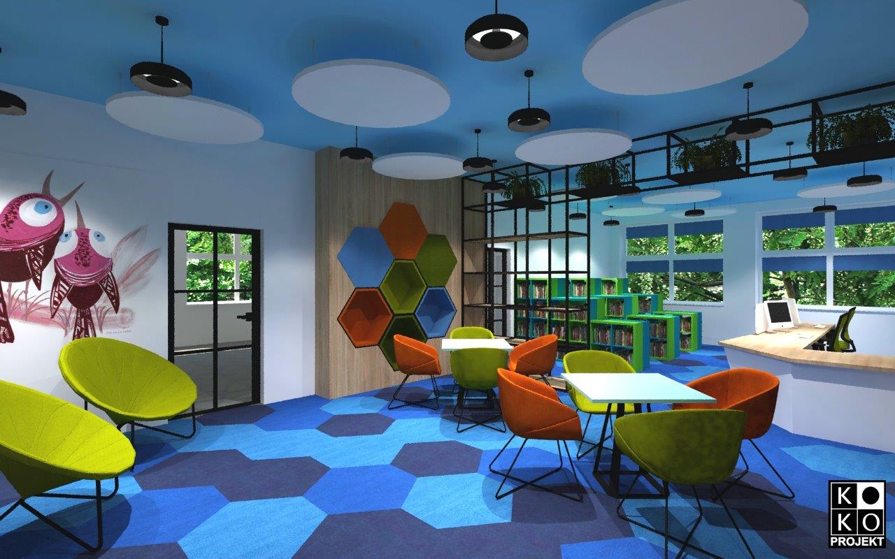 Projekt biblioteki w Szkole Podstawowej nr 8 w Policach – projekt wnętrz, wizualizacje